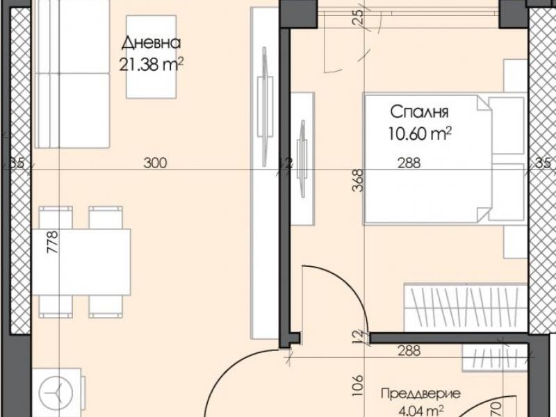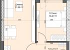Предложение за покупка на двустаен апартамент, представляващ: дневна с кухненски бокс и трапезария, спалня, баня с тоалетна, преддверие и тераса. Изложение: запад.