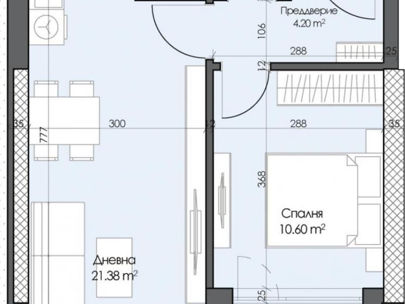 Предложение за покупка на двустаен апартамент с източно изложение, представляващ: дневна с кухненски бокс и трапезария, спалня, баня с тоалетна, преддверие и тераса.