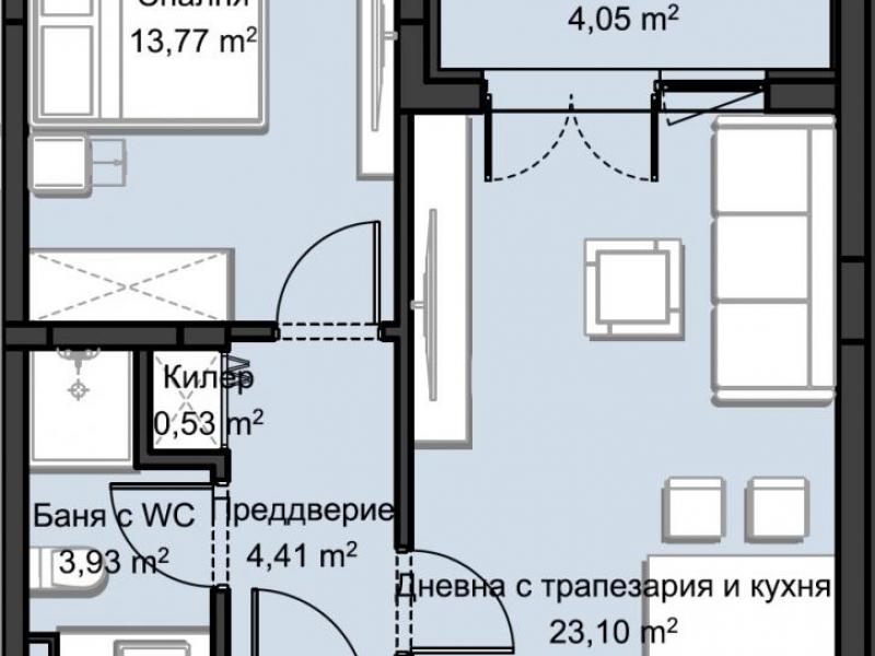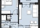 Едно от жилищата, което ви предлагаме е двустайно със западно изложение, представляващо: преддверие, дневна с кухненски бокс и трапезария, спалня, баня с тоалетна, лоджия и избено помещение.