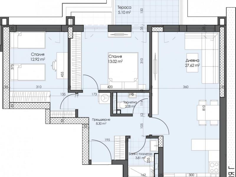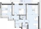 Предложение за покупка на тристаен апартамент, представляващ: дневна с кухненски бокс и трапезария, две спални, баня с тоалетна, отделно втора тоалетна, преддверие и тераса.