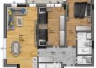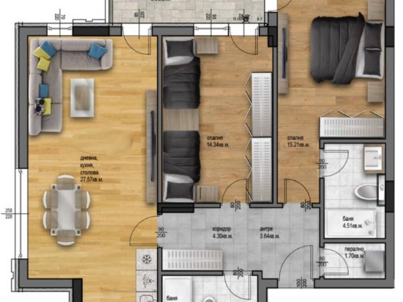 Жилището, което предлагаме за продажба е TРИСТАЙНО и се състои се от просторна дневна с кухненски бокс и трапезария-27,57 кв.м, две самостоятелни спални с площи 15,21 кв.м. и 14,34 кв.м, 2 бани с тоалетна, входно антре, коридор, перално помещение и тераса. Изложение: запад и север.